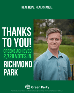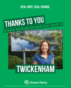Locally, we achieved a record result in Twickenham and retained our deposit in both our constituencies. All of us at the Richmond & Twickenham Green Party would like to express our sincere gratitude to everyone who supported our constituency candidates on July 4th.